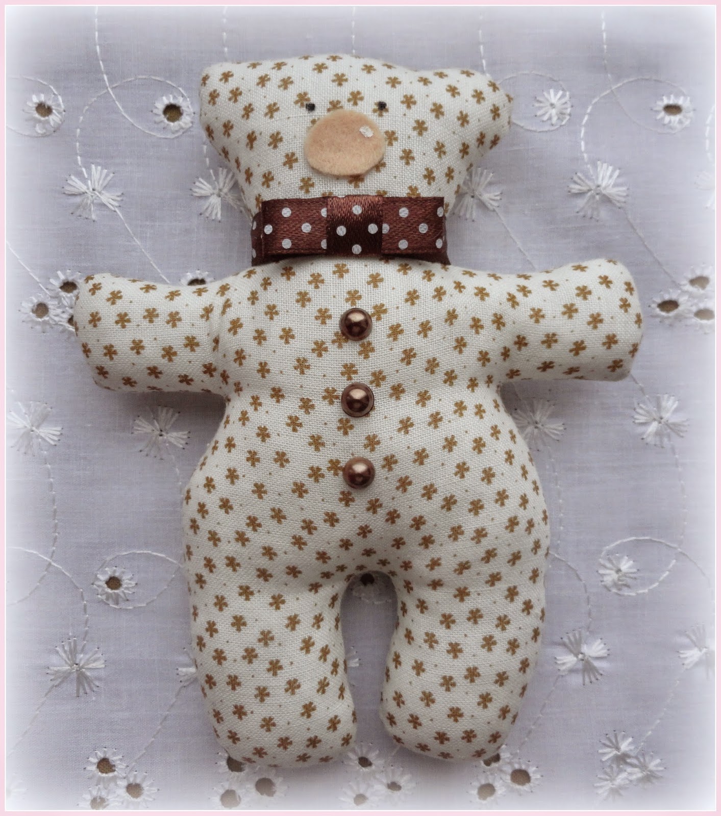 Сшились быстренько две мишутки из остатков ткани. Ткань хлопок, для украшения использовала сатиновые ленточки в горошек, полубусинки. Глазки нарисовала акриловой краской. Носик вырезала из фетра. Вот такие малюпочки получились.