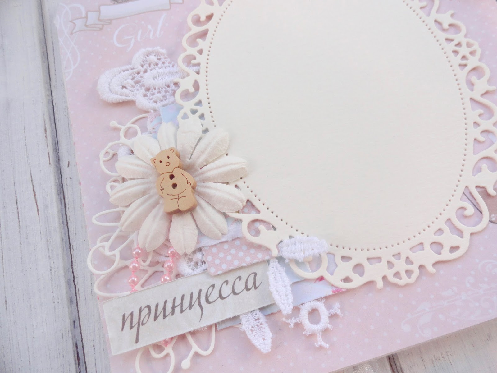 На каждом развороте ажурные подложки. Под подложками есть кармашки для тегов. На разворотах немного украшений. В основном использовала кружево различное и плоский декор. Для воздушности добавила ажурную вырубку и обрезки бумаги от Скрапберриз "Розы".