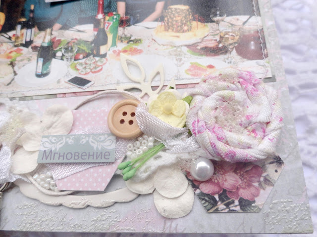 Альбом на 23 фотографии на 4 разворота, формат А5. Практически под всеми фотографиями есть карманы для тегов и памятных записочек. Все фотографии прошиты на машинке. Все странички с эмбоссингом штампом текст. Немного самодельных цветов и моей любимой текстурной пасты со стеклянными шариками.